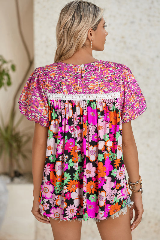 Rose Red Bubble Sleeve Lace Trim Floral Blouse