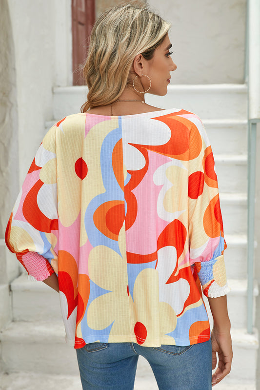 Yellow Colorful Floral Print Ribbed Dolman Blouse